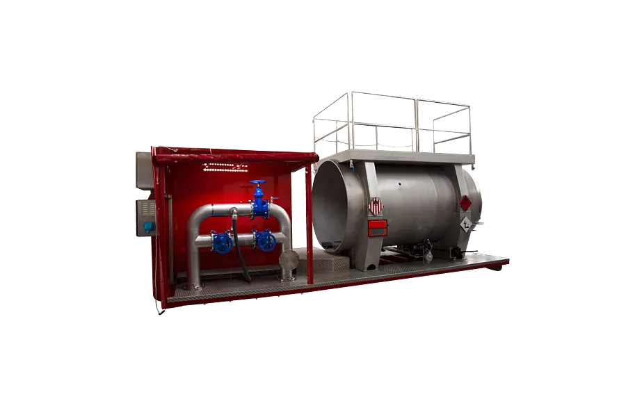 Die hier dargestellte Gefahrgutübungsanlage, wurde speziell zur Übung von Schadensfällen an Tankfahrzeugen, Tankcontainern, Tankkesselwagen (Eisenbahn) und Rohrleitungen (GSG-Lagen) entwickelt. Der Abrollbehälter besteht aus einer freistehenden Behälterattrappe und einem Geräteraum zur Unterbringung von Gerätschaften und einer Übungsanlage zum Abdichten von Leitungsleckagen.