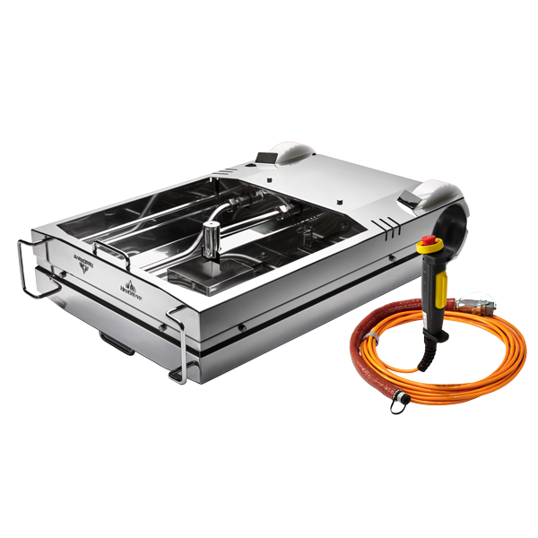 The training device is equipped with user-friendly transport wheels at the rear and transport handles at the front, making it easy to position and move around. A tilt sensor recognises the device's 2 operating positions. Liquid fires (fire class B) can be simulated in the 1st operating position. The 2nd operating position allows unrestricted use of all mock-up modules (demonstration of fire classes A/C). The connections for electricity, gas and the hand-held remote control are located on the side of the wheel hub. This enables the training device to be rotated at any time without the need for awkward handling.